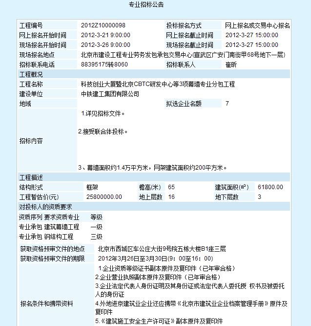 » 科技创业大厦暨北京CBTC研发中心等3项幕墙专业分包工程