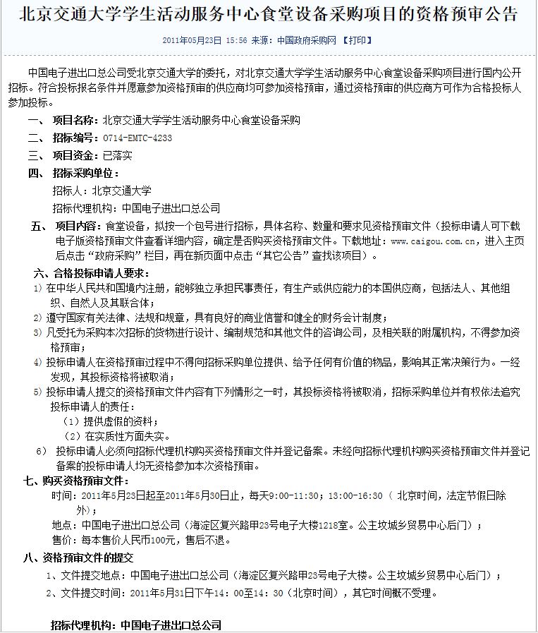 » 学生活动服务中心食堂设备采购项目资格预审公告