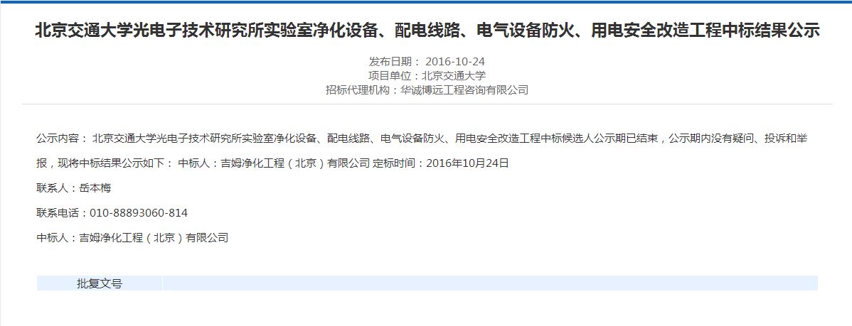 伟德国际1946集团有限公司 光电子技术研究所实验室净化设备、配电线路、电气设备防火、用电安全改造工程中标候选人公示