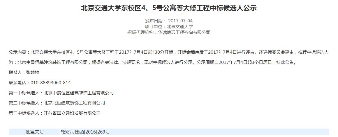 伟德国际1946集团有限公司东校区4、5号公寓等大修工程中标候选人公示